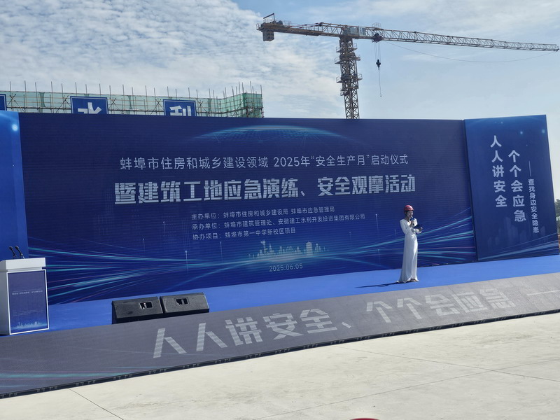 2025年6月5日上午,蚌埠市住房和建设领域2025年“安全生产月”启动仪式暨建筑工地急演练、安全观摩活动在安徽建工水利开发投资集团有限公司蚌埠第一中学新校区项目隆重举行。今年6月是我国第24个“安全生产月”,活动以“人人讲安全、个个会应急——查找身边安全隐患”为主题,该活动由蚌埠市住房和城乡建设局、蚌埠市应急管理局主办,蚌埠市建筑管理处、安徽建工水利开发投资集团有限公司等单位承办。蚌埠市住房和城乡建设局党组书记、局长孙如斌;省住建厅质安处副处长张晓燕;蚌埠经开区管委会二级调研员张鹏远;安徽建工水利党委书记、董事长,蚌埠市建筑业协会会长张键等相关单位领导、行业代表300余人参加活动,共同拉开安全生产月序幕。