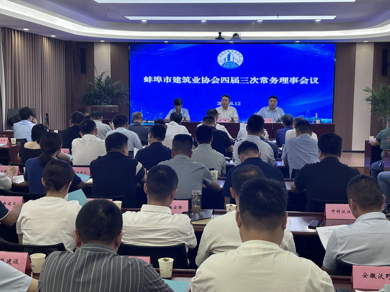 2025年6月12日上午,蚌埠市建筑业协会四届三次常务理事会议在会长单位安徽建工水利集团召开。协会会长,安徽建工水利集团党委书记、董事长张键;监事长,安徽禹都建设集团董事长程龙钊;秘书处负责同志以及协会副会长、常务理事单位代表近70人出席会议。会议聚焦协会规范运行与行业健康发展核心任务,高效完成了多项重要议程。